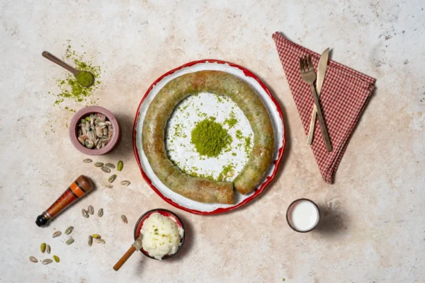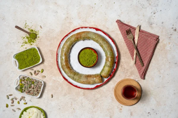 Katmer; Un, Yağ, Şeker, Sahan Kaymağı ve Antep Fıstığı kullanılarak imal edilir.
